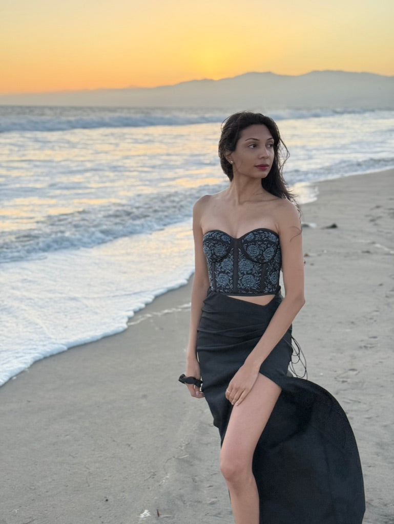 Introducing our Garden Bustier in slate, meticulously hand-beaded and beautifully embellished with sophisticated silvery/grey beaded floral embroidery. The corset lace-up back adds a touch of allure, while the floral details provide versatility and charm. Crafted with satin-lined bustier panels, this piece promises both comfort and elegance. The hidden side zip allows for easy wear, and a modesty panel enhances its graceful design.